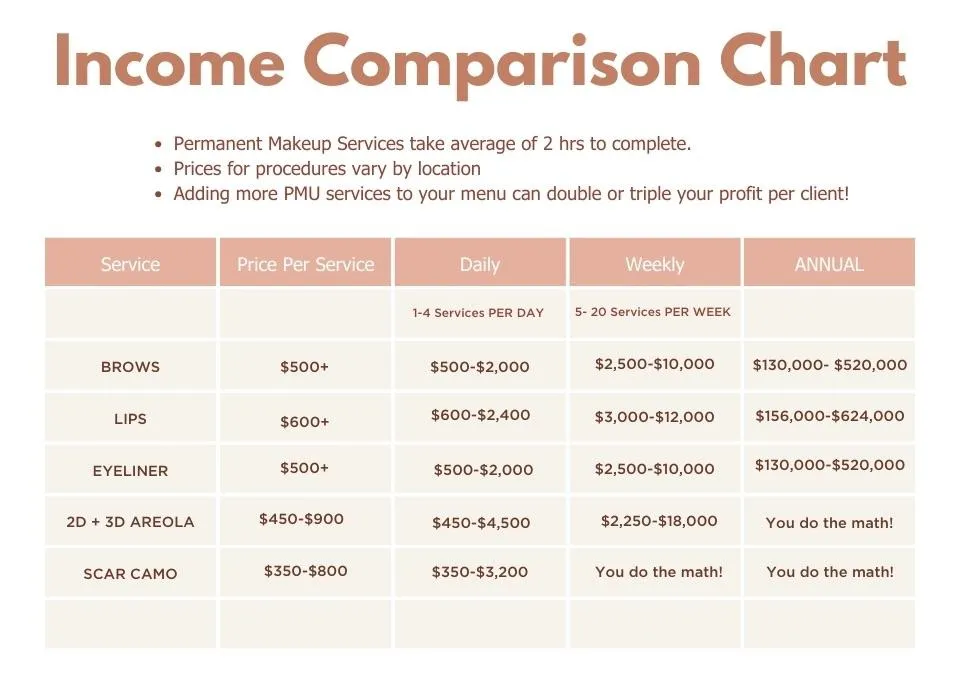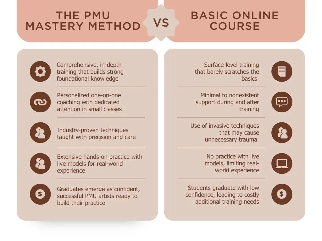 We have several options when it comes to your PMU training. Starting with the 3 week primary training: the PMU Mastery Method, you can chose to increase your menu of services (more revenue!) with our Eyeliner training, and Paramedical Art training that features 2D & 3D Areola + Scar Camouflage.